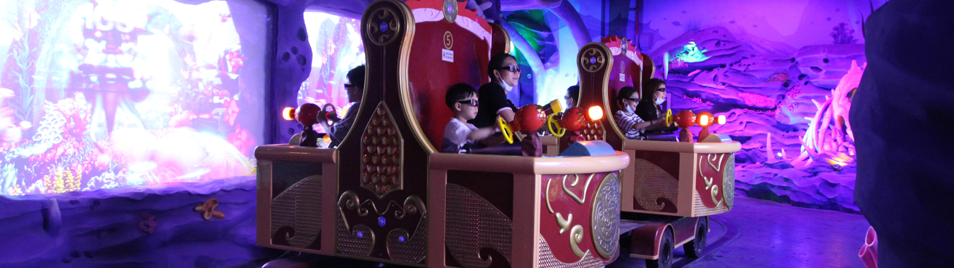 交互式黑暗乘騎游樂設備,是融合交互游戲、360度旋轉軌道車、主題景觀、多種特效等尖端技術于一體的室內體驗娛樂項目,讓乘客在逼真的虛擬場景中進行角色對抗,增加交互體驗。